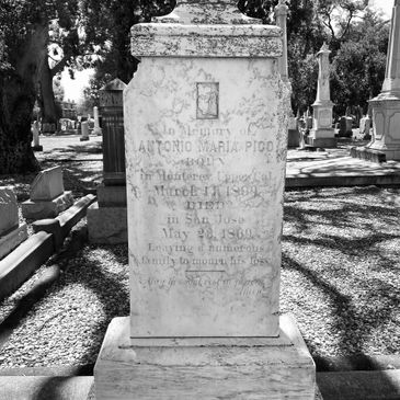 To walk through the older areas of the cemetery is to travel through nearly 165 years of history. At Santa Clara Mission Cemetery there repose many early Santa Clara Valley pioneers; Spaniards, Mexican, Americans, and others of rich and varied ethnic backgrounds. Included are Pedro de Saisset (French Vice-Consul, businessman and philanthropist),Triburcio Vasquez (known as the "Robin Hood Bandit"), Antonio Maria Pico (three times Alcalde of San Jose), Myles Poore O'Connor (lawyer, judge and philanthropist) and Peter Burnett (the first Governor of California).